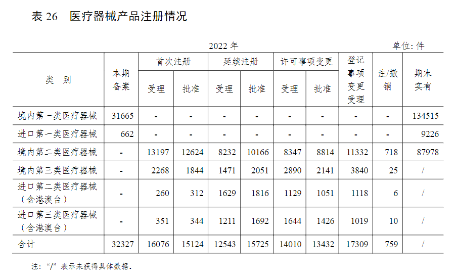 2023年04月19日国家药品监督管理局公布了药品监督管理统计年度数据(2022年),报告所用数据来源于药品监督管理统计调查制度的月报、季报和年报。除特殊说明外,数据报告期为 2022 年 1月 1 日至 2022 年 12 月31 日。本文整理了有关医疗器械相关的统计数据以供参考。